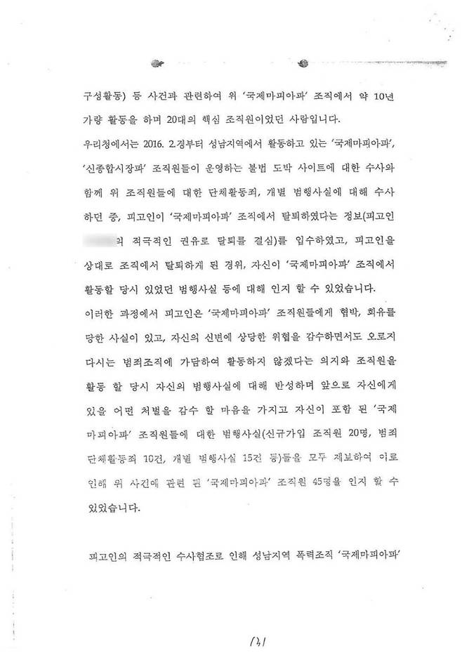 이어 경찰은 박씨의 적극적인 수사 협조로 국제마피아파 조직원 45명을 인지할 수 있었다고도 했다. 국제마피아파 조직의 범죄를 포착하는데 박씨의 ‘결정적인 제보’가 있었다는 것이다.