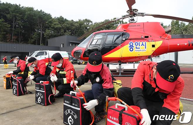 (용인=뉴스1) 김영운 기자 = 19일 오전 경기도 용인시 처인구 남동 산불대응센터에서 산불전문진화대원들 산불진화장비를 점검하고 있다. 용인시는 가을철 건조한 날씨와 등산객 증가 등 산불 발생 위험이 높아짐에 따라 18일부터 12월 15일까지를 가을철 산불조심기간으로 정해 본격 대응 체제를 운용한다고 밝혔다. 2021.10.19/뉴스1