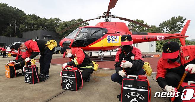 (용인=뉴스1) 김영운 기자 = 19일 오전 경기도 용인시 처인구 남동 산불대응센터에서 산불전문진화대원들 산불진화장비를 점검하고 있다. 용인시는 가을철 건조한 날씨와 등산객 증가 등 산불 발생 위험이 높아짐에 따라 18일부터 12월 15일까지를 가을철 산불조심기간으로 정해 본격 대응 체제를 운용한다고 밝혔다. 2021.10.19/뉴스1
