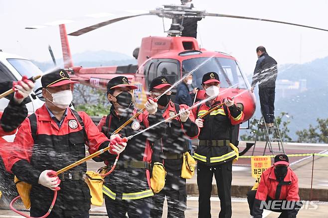 [용인=뉴시스] 김종택기자 = 19일 오전 경기도 용인시 처인구 산불대응센터에서 산불전문예방진화대원들이 각종 진화장비를 점검하고 있다. 용인시는 가을철 건조한 날씨와 등산객 증가 등 산불발생 위험이 높아짐에 따라 오는 12월15일까지를 가을철 산불조심 기간으로 정해 본격 대응체제를 구축한다고 밝혔다. 2021.10.19.