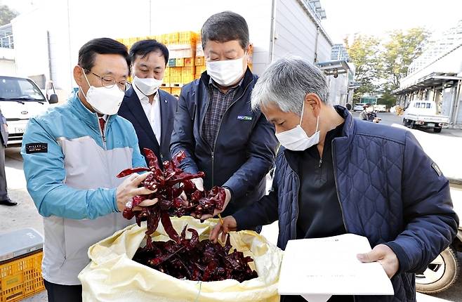 [괴산=뉴시스] 강신욱 기자 = 이차영 충북 괴산군수가 19일 괴산군조합공동사업법인이 진행하는 건고추 수매 현장을 찾아 건고추를 살펴보고 있다. 이번 건고추 수매는 이날부터 27일까지 농협별로 진행된다. (사진=괴산군 제공) 2021.10.19. photo@newsis.com