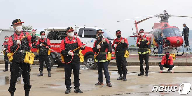 (용인=뉴스1) 김영운 기자 = 19일 오전 경기도 용인시 처인구 남동 산불대응센터에서 산불전문진화대원들 산불진화장비를 점검하고 있다. 용인시는 가을철 건조한 날씨와 등산객 증가 등 산불 발생 위험이 높아짐에 따라 18일부터 12월 15일까지를 가을철 산불조심기간으로 정해 본격 대응 체제를 운용한다고 밝혔다. 2021.10.19/뉴스1