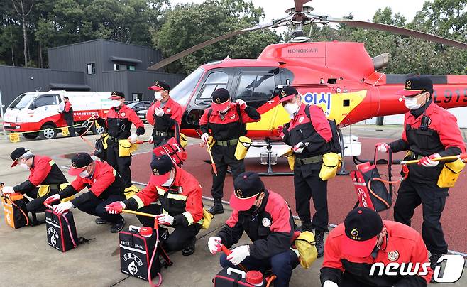 (용인=뉴스1) 김영운 기자 = 19일 오전 경기도 용인시 처인구 남동 산불대응센터에서 산불전문진화대원들 산불진화장비를 점검하고 있다. 용인시는 가을철 건조한 날씨와 등산객 증가 등 산불 발생 위험이 높아짐에 따라 18일부터 12월 15일까지를 가을철 산불조심기간으로 정해 본격 대응 체제를 운용한다고 밝혔다. 2021.10.19/뉴스1