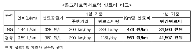콘크리트제조사의 지난 1년 운행 결과에 따르면 성능 및 운행 안전성에서도 매우 만족스러운 결과를 얻었다고 한다. 연료비도 경유 대비 연간 약 17% 정도의 절감효과가 있는 것으로 나타났다.