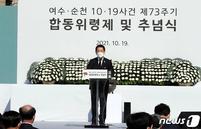 (여수=뉴스1) 전원 기자 = 김영록 전라남도지사가 19일 오전 여수시 이순신광장에서 여순사건 특별법이 제정된 이후 처음 열린 ‘여순사건 73주기 희생자 합동추념식’에서 추모사를 하고 있다.(전남도 제공) 2021.10.19/뉴스1
