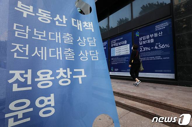 (서울=뉴스1) 박세연 기자 = 19일 서울 시내 한 은행 지점에 대출 안내문이 걸려있다.
