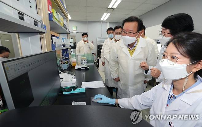 (청주=연합뉴스) 김주형 기자 = 김부겸 국무총리가 19일 오후 충북 청주시에 있는 식품의약품안전처를 격려 방문해 국가출하승인실험실 시설을 둘러보고 있다. 2021.10.19