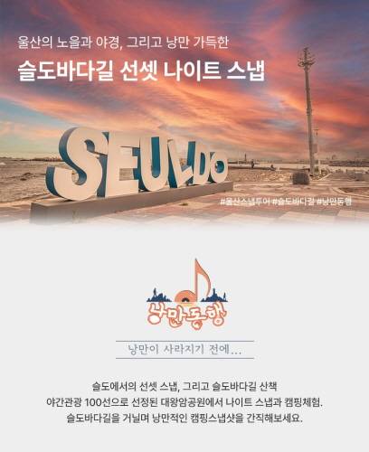 '낭만동행 스냅투어'는 소규모 인원 단위로 진행되며 슬도의 노을풍경과 더불어 슬도바다길을 거닐고 대왕암공원 나이트캠핑 체험을 하는 상품으로 2인 4만9천 원에 스냅사진을 촬영하는 상품이다.