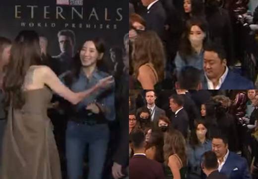 뿐만 아니라 마동석은 안젤리나 졸리에게 직접 예정화를 소개시켜 주기도. 이에 안젤리나 졸리는 월드 프리미어 현장을 카메라에 담고 있던 예정화에게 다가가 반갑게 포옹, 훈훈한 분위기를 연출했다. 예정화 또한 환한 미소로 화답했다.