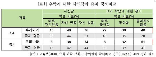국제적인 비교평가에서도 예외가 아니다. 2019년 국제 교육성취도 평가 협회가 전 세계 58개국의 초등학생과 38개국의 중학생을 대상으로 연구한 '수학·과학 성취도 추이 변화 국제비교 연구'에서 우리나라 초·중학생의 수학에 대한 흥미와 자신감은 국제 평균보다 훨씬 낮은 것으로 나타났다.