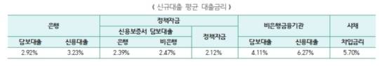 중소기업이 적용받은 평균 대출 금리는 ▲은행 담보대출 2.92% ▲은행 신용대출 3.23% ▲정책자금 2.12% ▲비은행 금융기관 담보대출 4.11% ▲비은행 신용대출 6.27% ▲사채 5.70% 등으로 조사됐다.