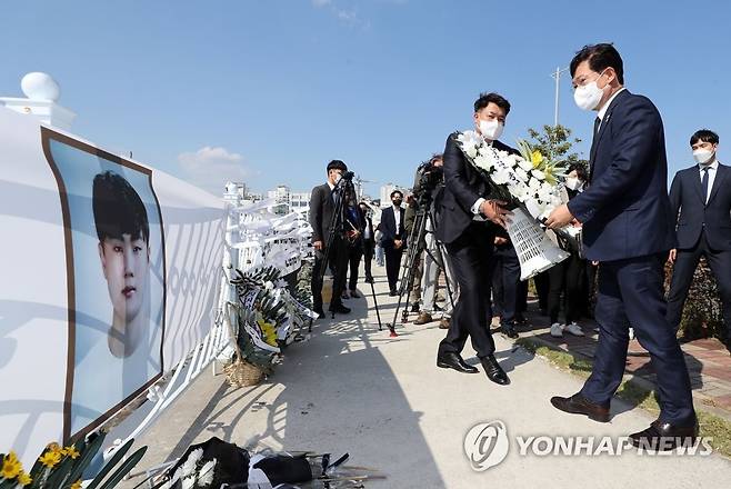 (여수=연합뉴스) 형민우 기자 = 더불어민주당 송영길 대표가 19일 오후 전남 여수시 웅천동 이순신 마리나를 찾아 현장실습 도중 잠수를 하다 숨진 홍정운 군의 명복을 빌며 헌화하고 있다. 여수 특성화고 3학년이던 홍 군은 지난 6일 요트 바닥에 붙은 따개비를 따러 잠수했다 참변을 당했다. 2021.10.19
