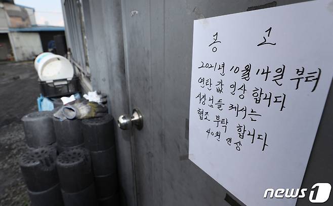 (화성=뉴스1) 김영운 기자 = 때이른 가을 한파에 쌀쌀한 날씨가 이어진 19일 오후 경기도 화성시의 한 연탄배급소에서 연탄가격 인상을 알리는 공고문이 붙어있다. 2021.10.19/뉴스1