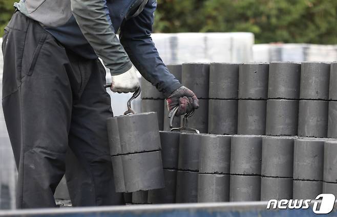 (화성=뉴스1) 김영운 기자 = 때이른 가을 한파에 쌀쌀한 날씨가 이어진 19일 오후 경기도 화성시의 한 연탄배급소에서 관계자가 연탄을 옮기고 있다. 2021.10.19/뉴스1