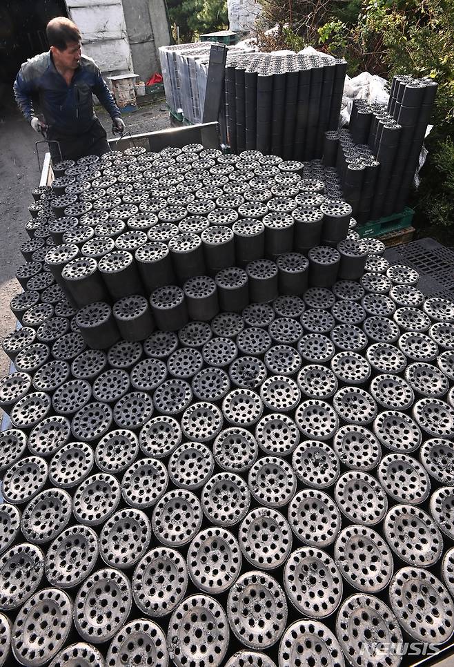 [화성=뉴시스] 김종택기자 = 아침저녁으로 쌀쌀한 날씨가 이어진 19일 오후 경기도 화성시 한 연탄배급소에서 직원이 늘어난 주문량을 맞추기 위해 연탄을 차량으로 옮기고 있다. 2021.10.19.