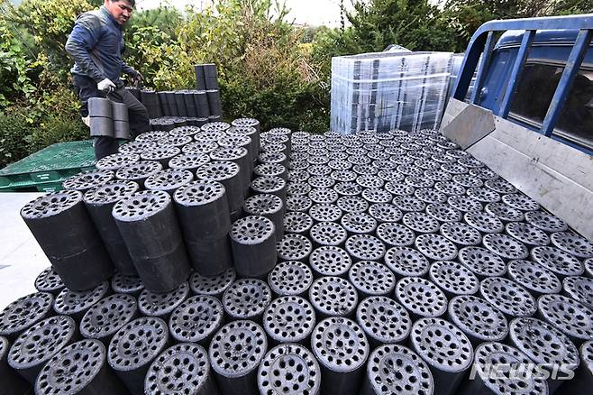 [화성=뉴시스] 김종택기자 = 아침저녁으로 쌀쌀한 날씨가 이어진 19일 오후 경기도 화성시 한 연탄배급소에서 직원이 늘어난 주문량을 맞추기 위해 연탄을 차량으로 옮기고 있다. 2021.10.19.