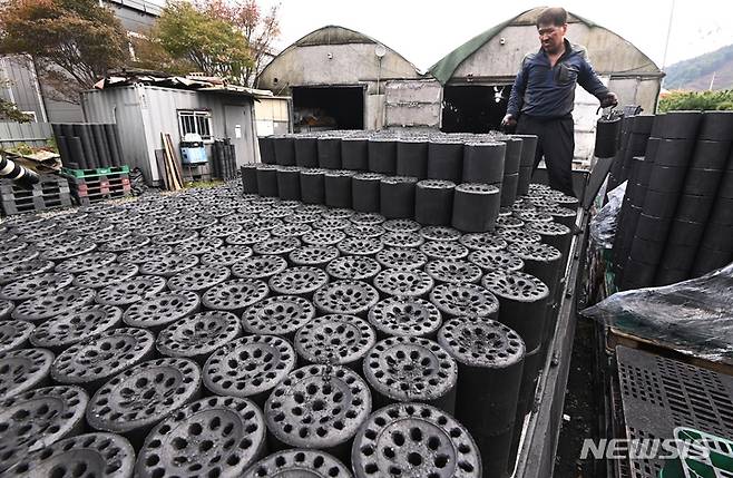 [화성=뉴시스] 김종택기자 = 아침저녁으로 쌀쌀한 날씨가 이어진 19일 오후 경기도 화성시 한 연탄배급소에서 직원이 늘어난 주문량을 맞추기 위해 연탄을 차량으로 옮기고 있다. 2021.10.19.