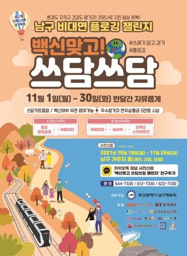 부산남구체육회(회장 정춘식)가 주관하고 부산 남구(구청장 박재범)가 후원하는 '백신맞고 쓰담쓰담' 비대면 플로깅 캠페인이 11월 1일부터 11월 30일까지 한 달간 이기대와 오륙도 일원에서 개최된다.