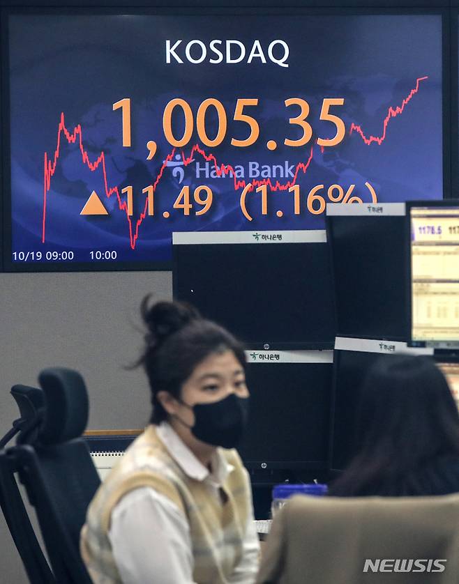 [서울=뉴시스] 조수정 기자 = 코스닥이 전 거래일(993.86)보다 11.49포인트(1.16%) 오른 1005.35에 장 마감한 19일 오후 서울 중구 하나은행 딜링룸에서 전광판에 지수가 표시되고 있다. 2021.10.19. chocrystal@newsis.com