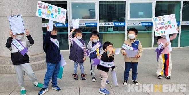 [무안=쿠키뉴스] 신영삼 기자 =전남교육청 직장보육시설인 꿈자람어린이집 아이들이 19일, 선생님과 함께 만든 피켓을 들고 도교육청사를 돌며 금연을 호소했다.