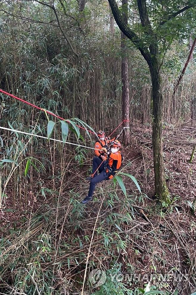 (광주=연합뉴스) 광주 광산구 어등산에서 소방구조대가 지난 13일 산악사고 대비 특별구조훈련에 참여하고 있다. 광주 광산소방서는 등산객 추락과 고립 등 사고가 발생한 상황을 가정해 초기 수색, 밧줄 구조, 환자 이송 등 절차를 점검했다. 지난해 전국 산악사고의 35.2%에 달하는 3천730건이 가을철 발생했다. 2021.10.19 [광주 광산소방서 제공. 재판매 및 DB 금지]
