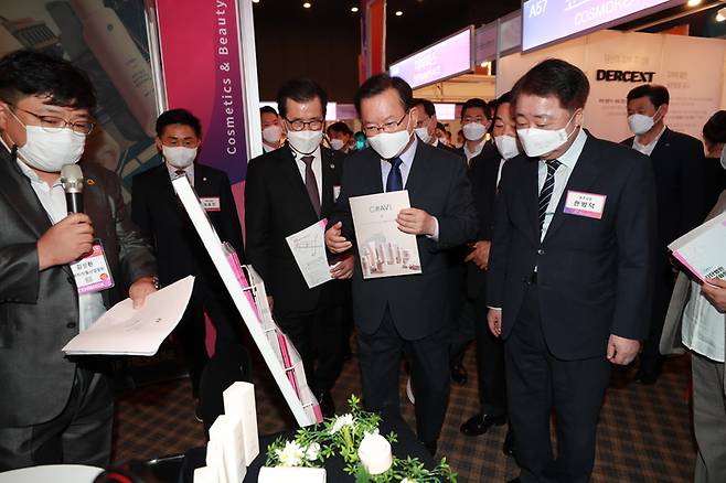 [청주=뉴시스] 천영준 기자 = 19일 충북 청주 오송역에서 열린 2021 오송 화장품·뷰티산업엑스포 개막식에 참석한 김부겸 국무총리(오른쪽 두 번째)가 전시장을 둘러보고 있다. 엑스포는 오는 23일까지 온·오프라인으로 열린다. (사진=충북도 제공) 2021.10.19.