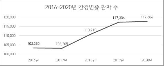 간세포에 염증이 반복되면 정상 세포는 파괴되고 상처의 회복과정에서 흉터 조직처럼 대체된다. 이를 ‘섬유화’라고 한다. 간 섬유화가 진행된 곳은 제 기능을 수행하지 못하고 정상 간 조직의 양은 그만큼 줄어들기 때문에 간 기능도 떨어진다. 간의 섬유화가 심하고 광범위하게 진행되면 간이 딱딱해지면서 쪼그라드는 간경변증으로 진행할 수 있다. 간경변증 환자는 지속해서 증가하는 추세다. 건강보험심사평가원의 국민관심질병 통계에 따르면, 간경변증 환자는 2016년 10만3,350명에서 2020년 11만7,686명으로 5년 새 13.8%가량 증가했다.