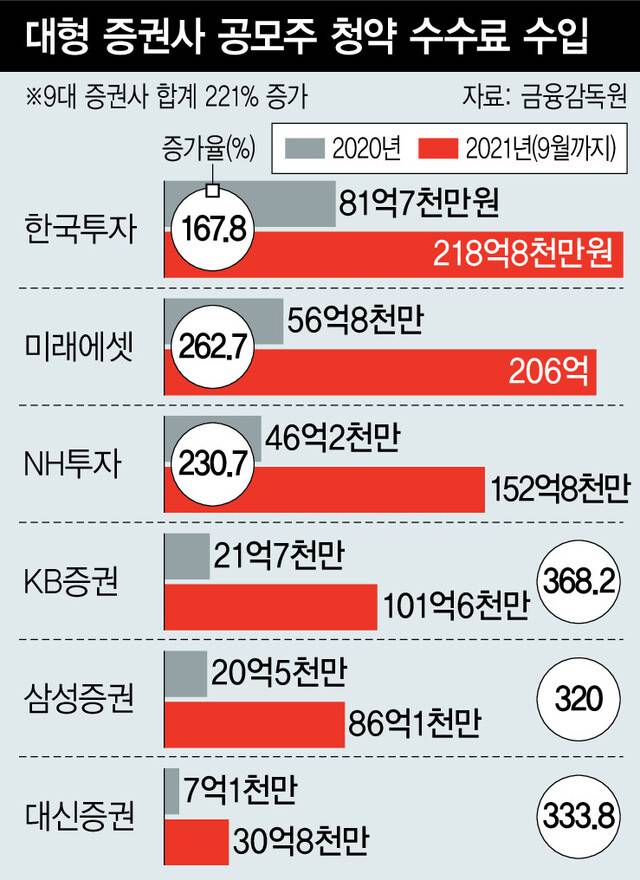 공모주 시장 활황을 등에 업고 증권사들이 ‘수수료 잔치’를 벌이고 있는 것으로 나타났다. 대형 증권사들이 앞다퉈 개인투자자들에게 청약 수수료를 물려 수입이 급증한 덕분이다.