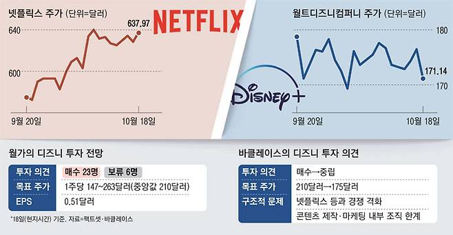 반면 넷플릭스에 대해서는 최근 긍정적인 평가가 두드러진다. 같은 날 바클레이스는 넷플릭스에 대해 3분기 호실적 기대감 등을 근거로 '매수' 투자 의견을 유지했다. UBS증권도 넷플릭스에 대해 '매수' 투자 의견을 유지하고 목표 주가를 620달러에서 720달러로 상향했다. '오징어게임' 등 신규 시리즈가 인기를 끌면서 구독자 증가세가 커질 것이라는 이유에서다.