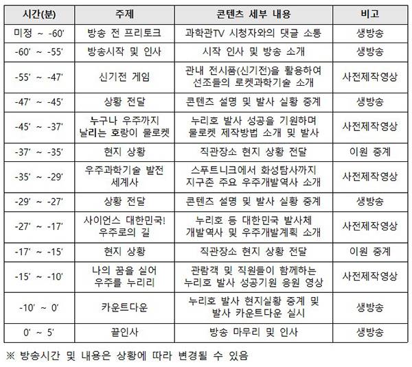 특히 누리호 발사를 직접 볼 수 있는 장소를 찾아가 방송을 통해 현장 분위기와 국민들의 기대감을 생생하게 중계하고, 발사장면을 원거리에서 촬영해 누리호 발사 순간을 시청자들과 함께 할 예정이다.