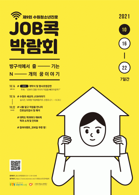 제9회 수원청소년진로JOB콕박람회는 코로나19 상황에서도 청소년들이 안전하고 의미 있는 진로 탐색을 이어갈 수 있도록 박람회 전용 온라인 플랫폼을 구축했으며, 107개의 종합 진로 콘텐츠를 제공한다.