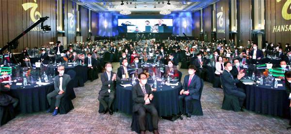재외동포경제단체가 주최하고, 재외동포재단과 매일경제·MBN 주관으로 19일 서울 잠실 롯데호텔월드에서 개막한 제19차 세계한상대회 개회식에서 참석자들이 박수를 치고 있다. 앞줄 가운데 테이블 왼쪽부터 시계 반대 방향으로 장대환 매경미디어그룹 회장, 김성곤 재외동포재단 이사장, 이준석 국민의힘 대표, 이숙진 제마이홀딩스그룹 대표, 하용화 세계한인무역협회 회장. 세계한상대회는 '기후변화 대응을 위한 4차 산업혁명과 그린뉴딜'이라는 주제로 3일간 진행된다.