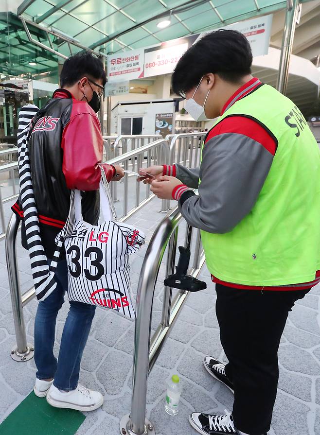 [서울=뉴시스] 배훈식 기자 = 수도권 야구장 관중 입장이 재개된 19일 오후 서울 송파구 잠실야구장에서 열린 2021 KBO리그 LG 트윈스와 키움 히어로즈와의 경기를 찾은 프로야구 팬이 입장하고 있다. 2021.10.19. dahora83@newsis.com *재판매 및 DB 금지