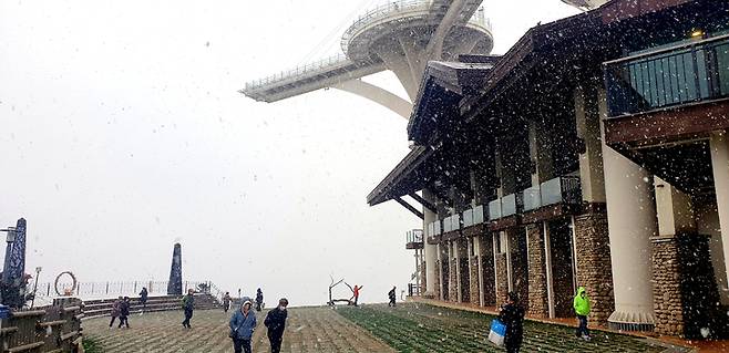 [평창=뉴시스] 김경목 기자 = 19일 오후 관광객들이 강원도 평창군 발왕산에서 올 가을 첫눈을 맞으며 즐거운 한때를 보내고 있다. (사진=용평 리조트 제공) 2021.10.19. photo@newsis.com *재판매 및 DB 금지