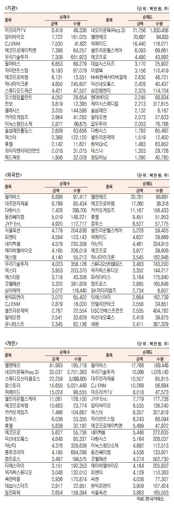 - [표]주간 코스닥 기관·외국인·개인 순매수·도 상위종목(10월 12일~15일)