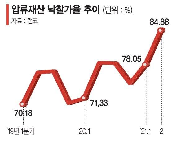 19일 캠코 압류재산 연도별 낙찰가율을 보면 올 2·4분기에 84.9%를 기록하며 문재인 정권 출범 이후 18분기 만에 최고 기록을 달성했다.