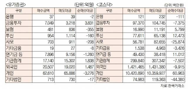[표]유가증권 코스닥 투자주체별 매매동향(10월 19일-최종치)