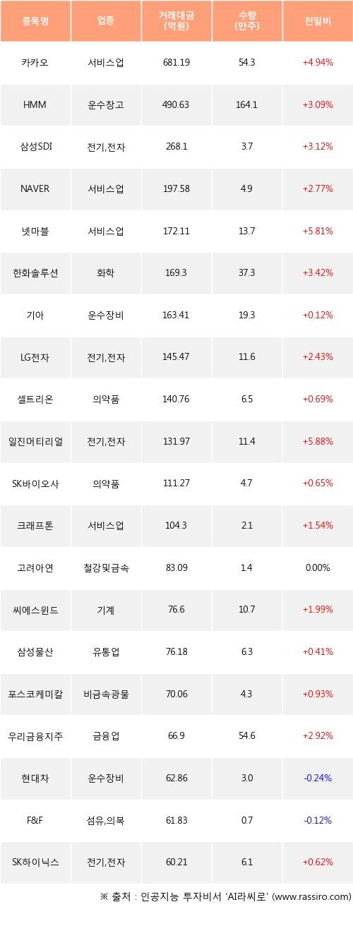 외국인 투자자의 순매수 상위 20개 종목은 카카오, HMM, 삼성SDI, NAVER, 넷마블, 한화솔루션, 기아, LG전자, 셀트리온, 일진머티리얼즈등이다.