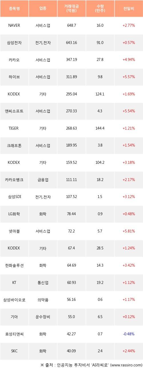 NAVER, 삼성전자, 카카오 등은 전일 대비 주가가 상승했고, 효성티앤씨 등은 주가가 하락했다.