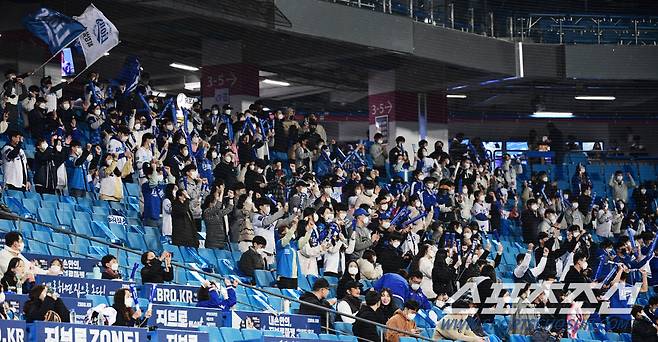 19일 대구 삼성라이온즈파크에서 KBO리그 삼성과 두산의 경기가 열렸다. 경기장을 찾은 삼성 팬들이 열띤 응원을 펼치고 있다. 대구=송정헌 기자 songs@sportschosun.com/2021.10.19/