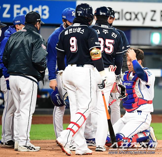 19일 대구 삼성라이온즈파크에서 KBO리그 삼성과 두산의 경기가 열렸다. 2회초 두산 페르난데스가 헛스윙하며 방망이를 놓쳤다. 페르난데스 방망이에 얼굴을 가격 당한 삼성 강민호 포수가 고통을 호소하고 있다. 대구=송정헌 기자 songs@sportschosun.com/2021.10.19/