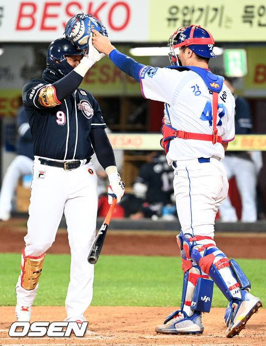2회초 두산 선두타자로 나온 페르난데스가 헛스윙때 뒤로 배트를 놓치며 삼성 강민호의 헬멧쪽을 배트로 때렸다. 삼성 강민호가 자리에서 일어선 후 페르난데스의 머리를 장난으로 때리고 있다. 2021.10.19 / rumi@osen.co.kr