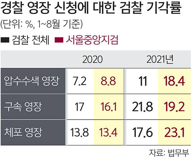 서울중앙지검의 경우 올해 1∼8월 압수수색 영장 기각률은 18.4%로 전국 지검 중 가장 높았다. 전년 동기(8.8%)보다 2배 이상 늘어난 규모로, 기각률이 가장 낮은 서울서부지검(3.1%)과 비교하면 6배 가까이 된다. 서울북부지검(14.6%), 전주지검(13.2%), 서울남부지검(12.1%)도 평균보다 기각률이 높았다.