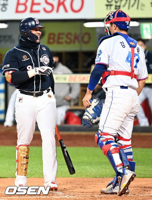 2회초 두산 선두타자로 나온 페르난데스가 헛스윙때 뒤로 배트를 놓치며 삼성 강민호의 헬멧쪽을 배트로 때렸다. 삼성 강민호가 자리에서 일어선 후 페르난데스와 얘기를 나누고 있다. 2021.10.19 / rumi@osen.co.kr