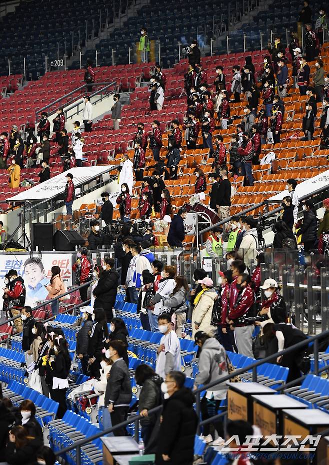 2021 KBO리그 LG 트윈스와 키움 히어로즈의 경기가 19일 잠실구장에서 열렸다. 경기장을 찾은 관중들이 국민의례를 하고 있다. 잠실=박재만 기자 pjm@sportschosun.com/2021.10.19/