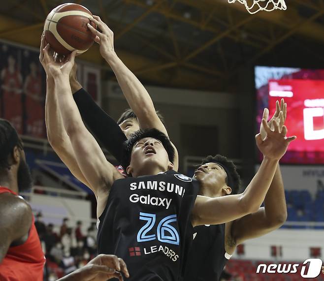 (울산=뉴스1) 윤일지 기자 = 19일 오후 울산 동천체육관에서 열린 '2021-2022 KGC인삼공사 정관장 프로농구' 울산 현대모비스와 서울 삼성의 경기에서 삼성 차민석이 현대모비스 장재석과 리바운드 다툼을 벌이고 있다. 2021.10.19/뉴스1