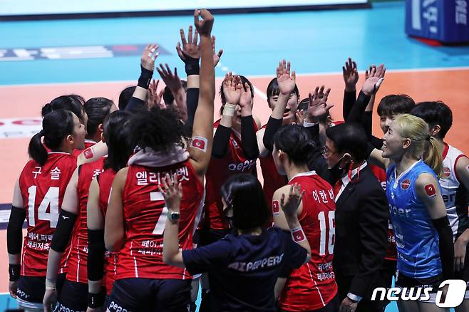 (광주=뉴스1) 황희규 기자 = 19일 오후 광주 서구 화정동 염주종합체육관에서 프로배구 '2021-22시즌 도드람 V리그' 여자부 페퍼저축은행과 KGC인삼공사의 경기가 시작되기 앞서 페퍼저축은행 선수들이 첫 경기를 앞두고 화이팅을 외치고 있다. 2021.10.19/뉴스1