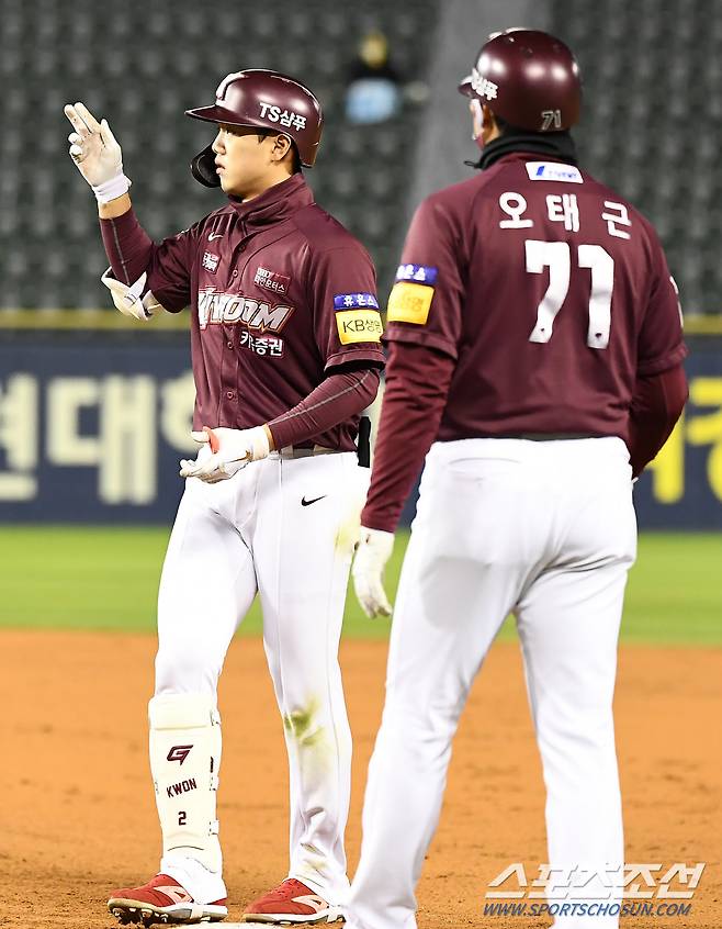 2021 KBO리그 LG 트윈스와 키움 히어로즈의 경기가 19일 잠실구장에서 열렸다. 5회초 1사 1루 키움 변상권이 안타를 날린 뒤 환호하고 있다. 잠실=박재만 기자 pjm@sportschosun.com/2021.10.19/