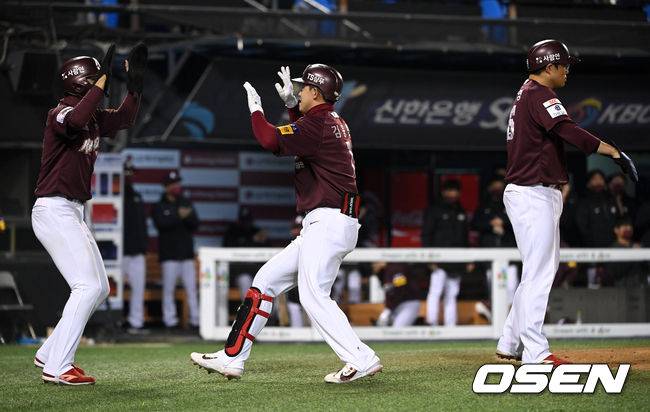 5회초 1사 1, 2루 상황 대타로 나선 키움 김웅빈이 달아나는 우월 스리런포를 날리고 홈을 밟으며 변상권-이지영과 기뻐하고 있다. / dreamer@osen.co.kr