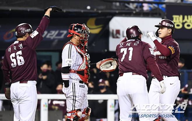 2021 KBO리그 LG 트윈스와 키움 히어로즈의 경기가 19일 잠실구장에서 열렸다. 5회초 1사 1,2루 키움 김웅빈이 스리런포를 날린 뒤 하이파이브를 나누고 있다. 잠실=박재만 기자 pjm@sportschosun.com/2021.10.19/